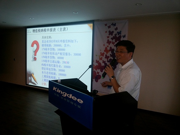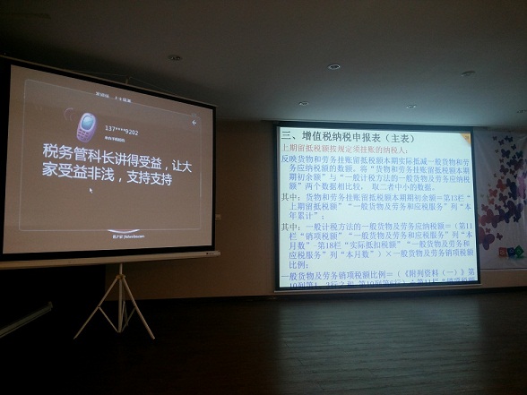 结合目前国税系统进行的营改增的实施,我们还特意邀请了黄岛区国税局的管洪宁科长,进行了“营改增—一般纳税人纳税申报”的培训,使参会人员掌握了营改增后,在纳税申报方面的改变和调整。管科长的讲解使参会客户受益匪浅,客户朋友给予了很高的评价。